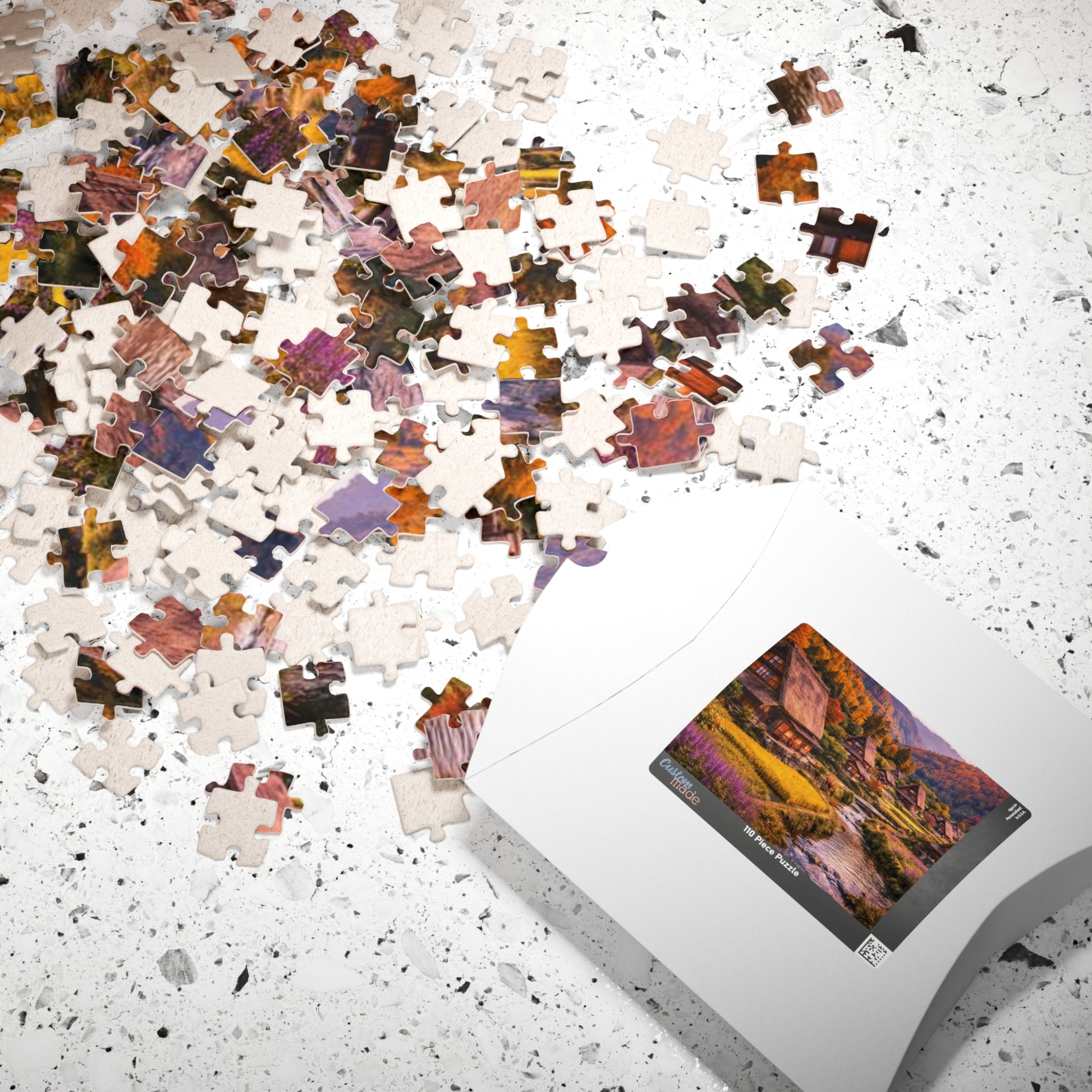 Slide into a quiet afternoon in a mountain village. This puzzle brings a sunlit valley to your table — timbered houses, a ribbon of river, and fields glowing with autumn gold. Each piece clicks with satisfying precision; the glossy surface sharpens the colors so the scene feels almost photographic. Work it slowly with a cup of tea, or spread it out for family time. When the last piece fits, you’ll have a vivid print ready to admire or frame — a small window to return to again and again.