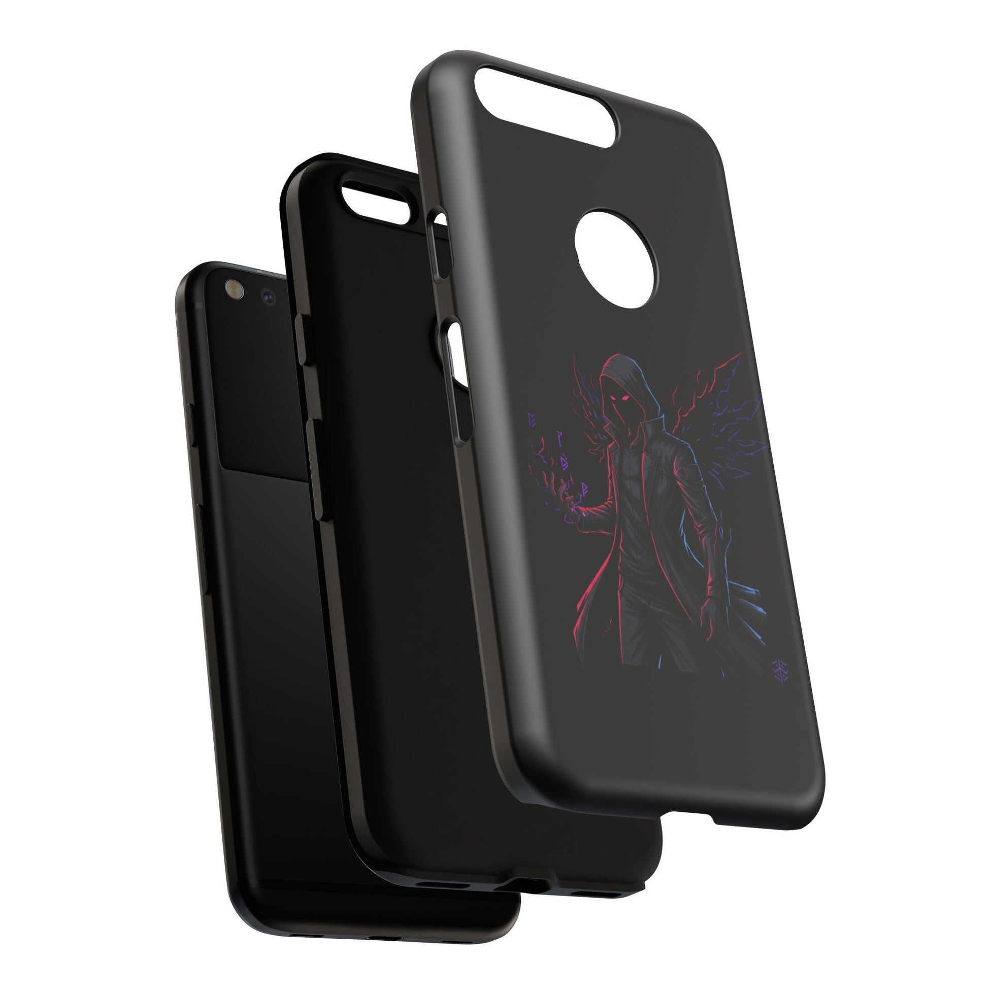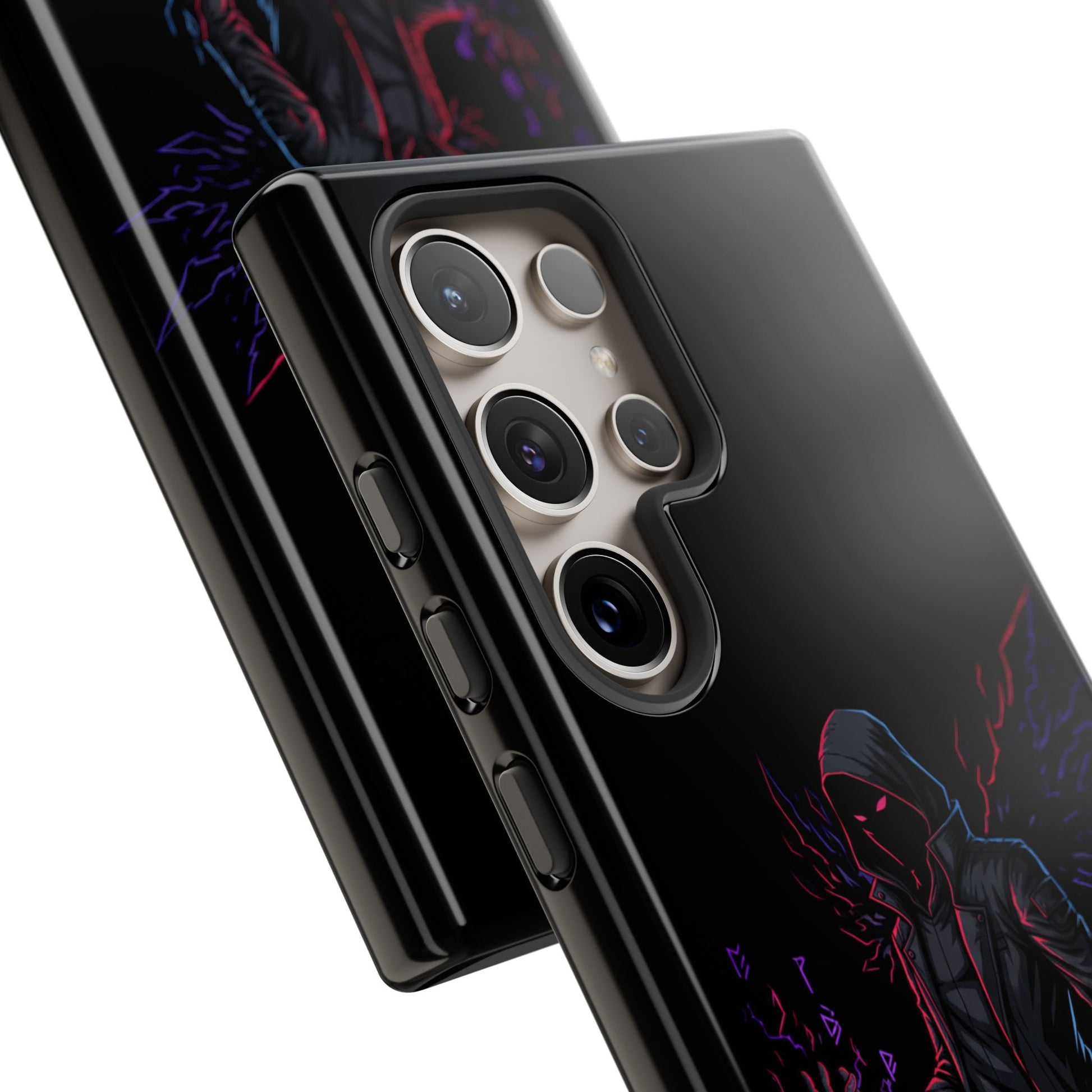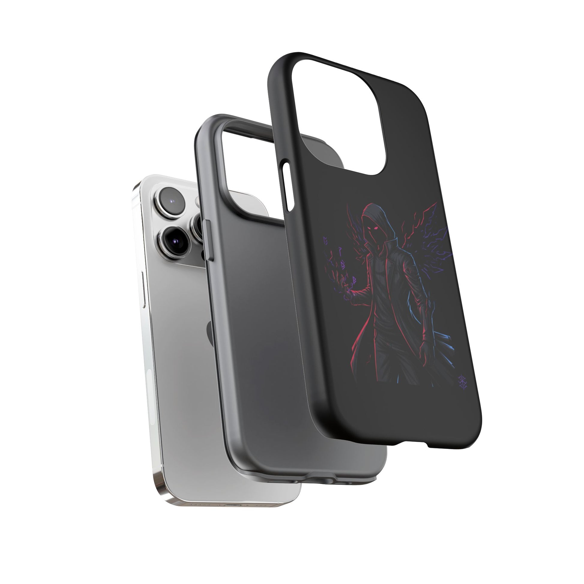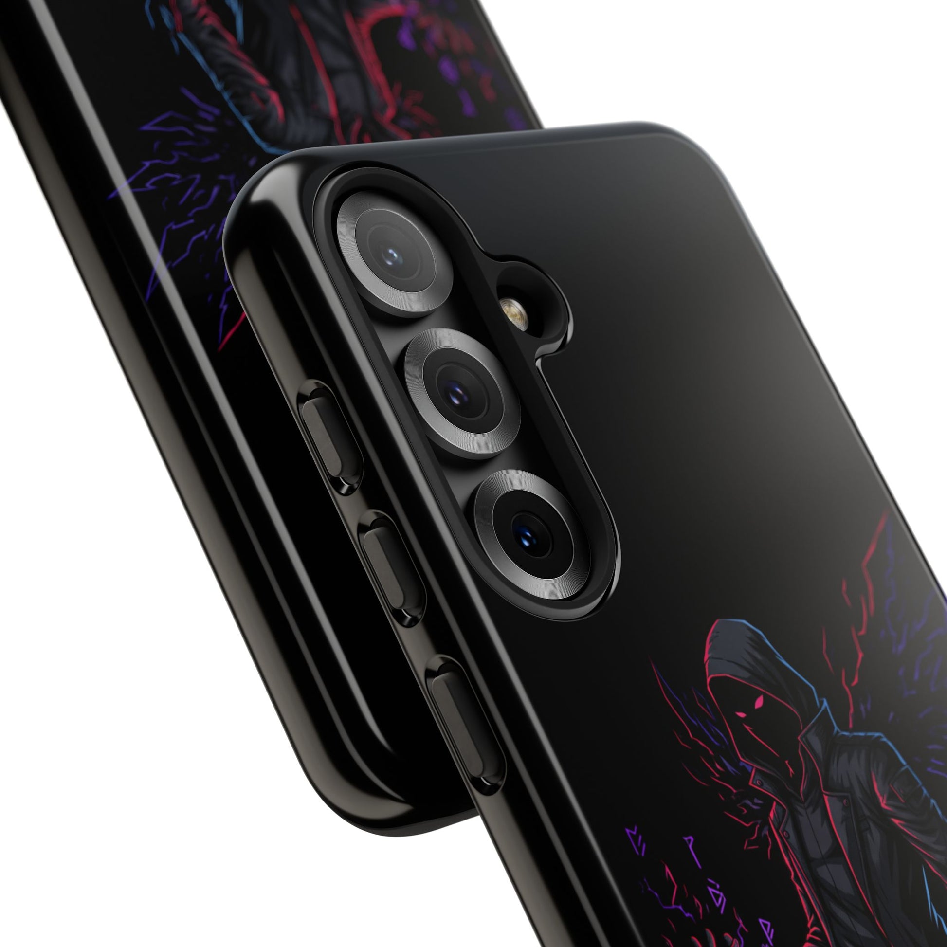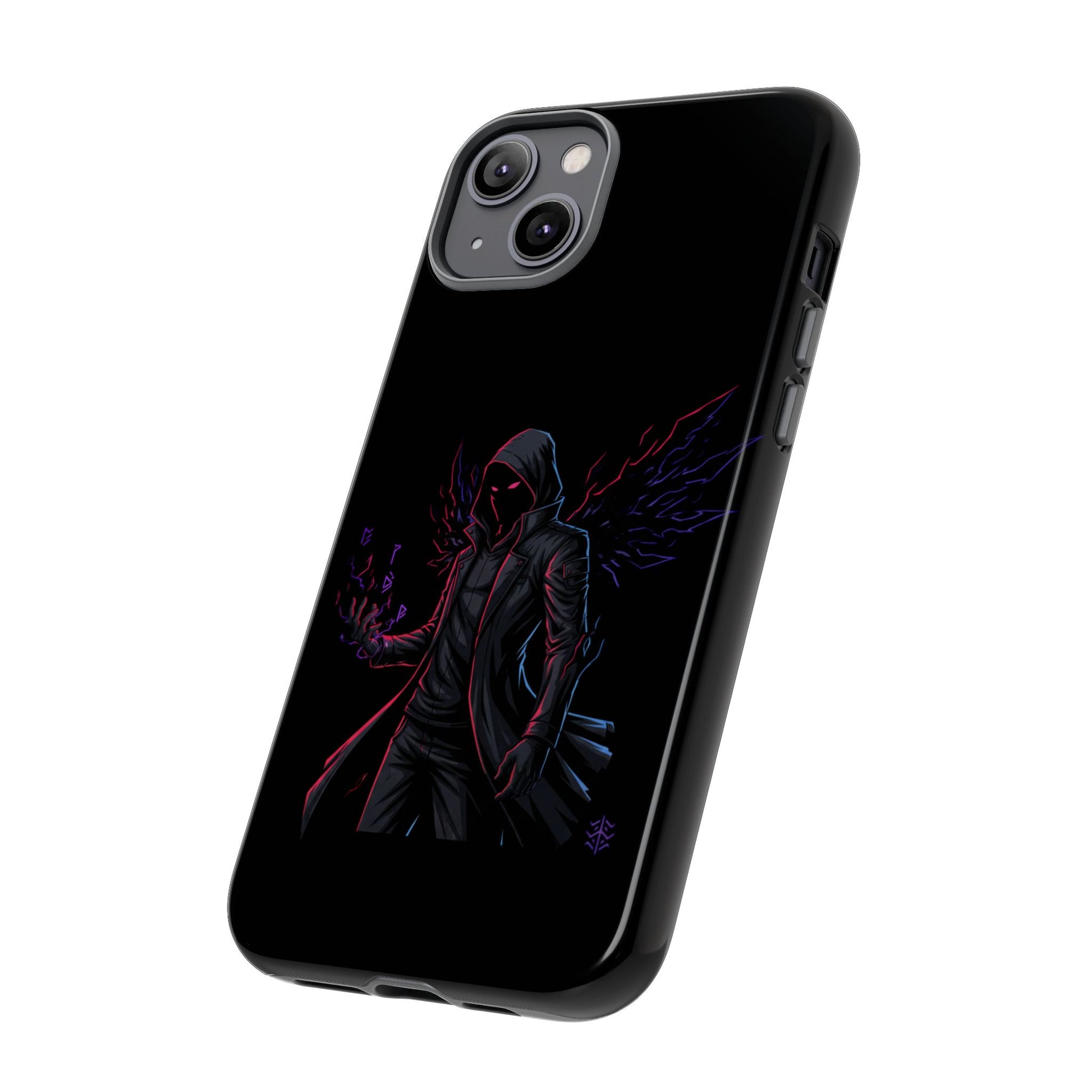 Dark Hoodie Shadow Warrior Phone Case – Protective Tough Case with Neon Winged Grim Reaper Design