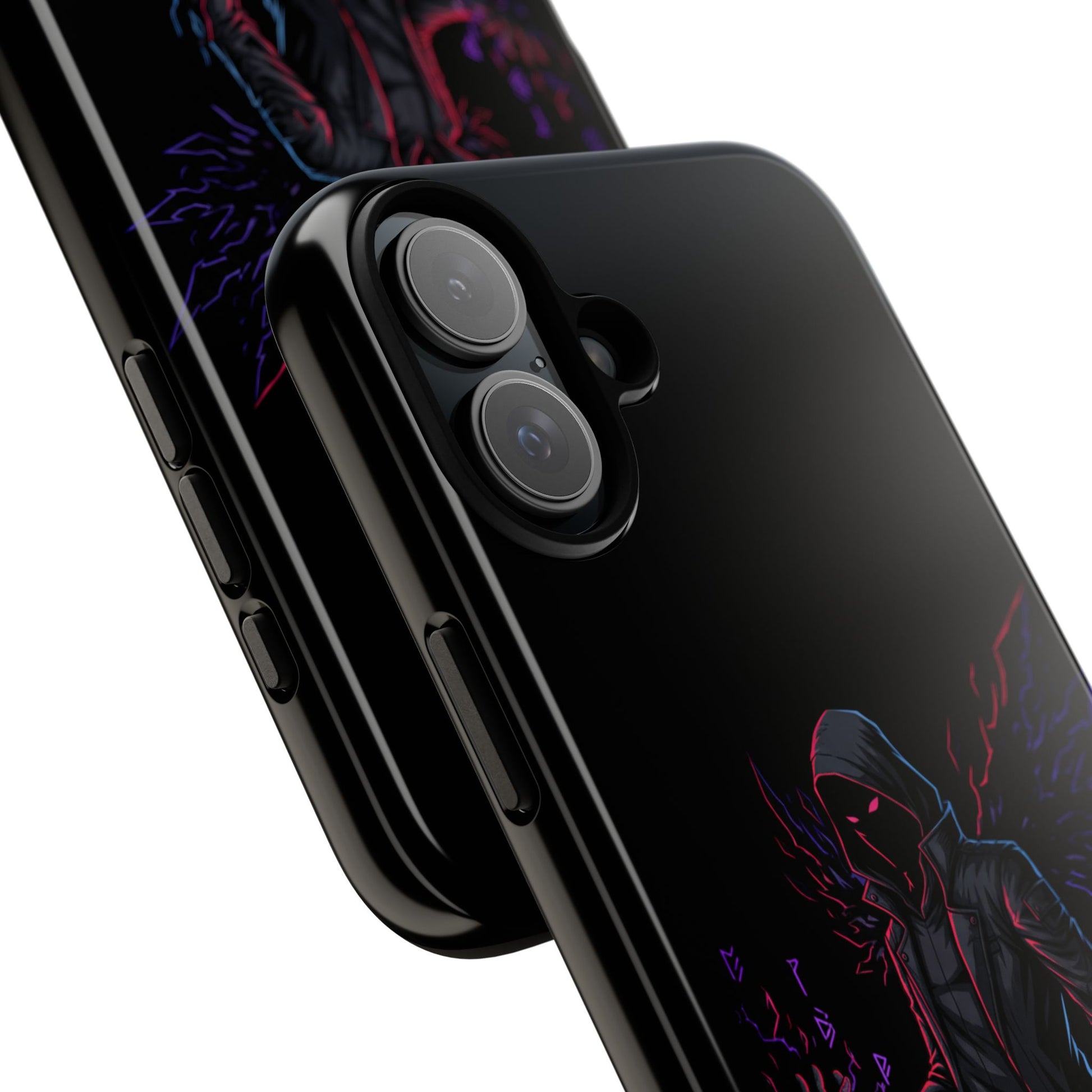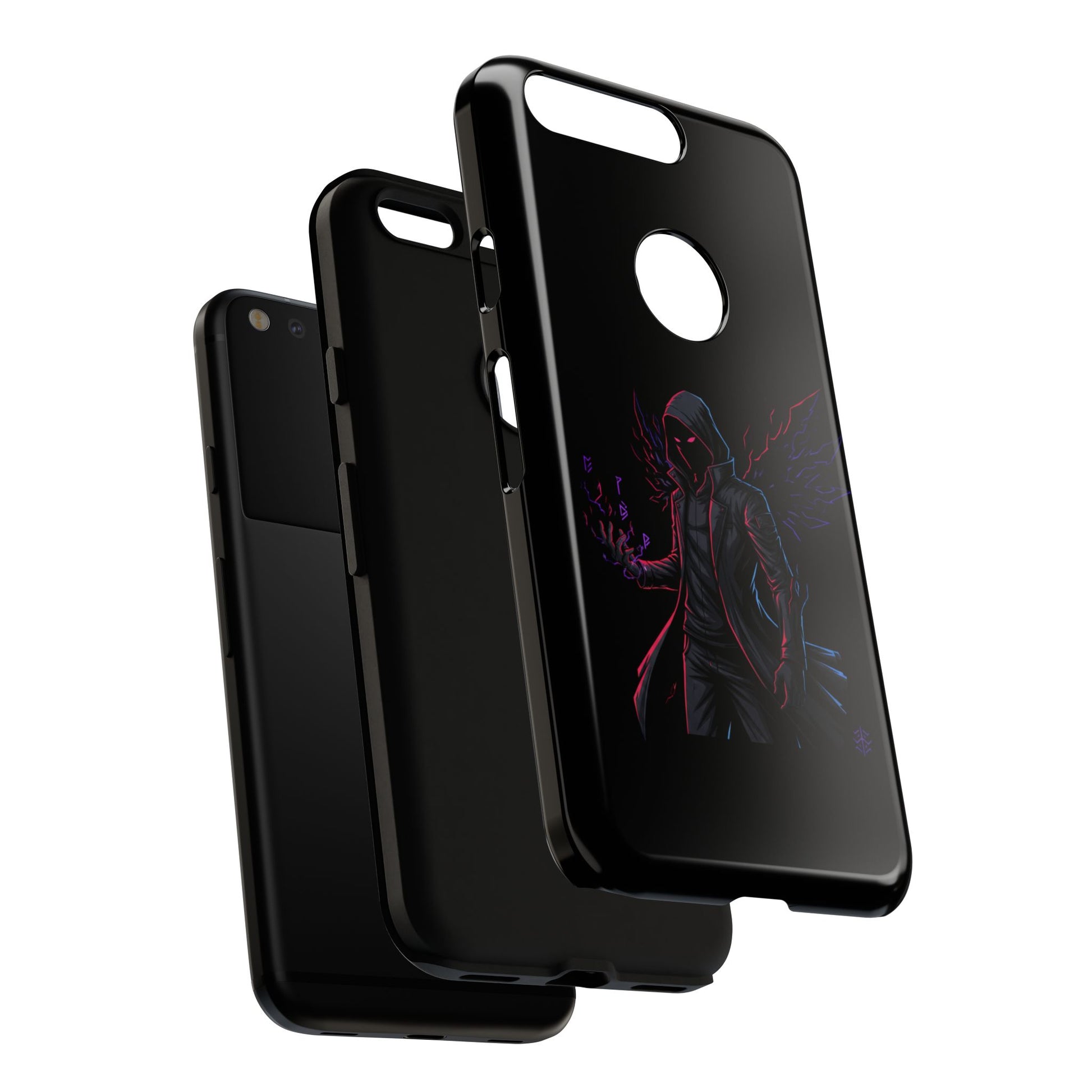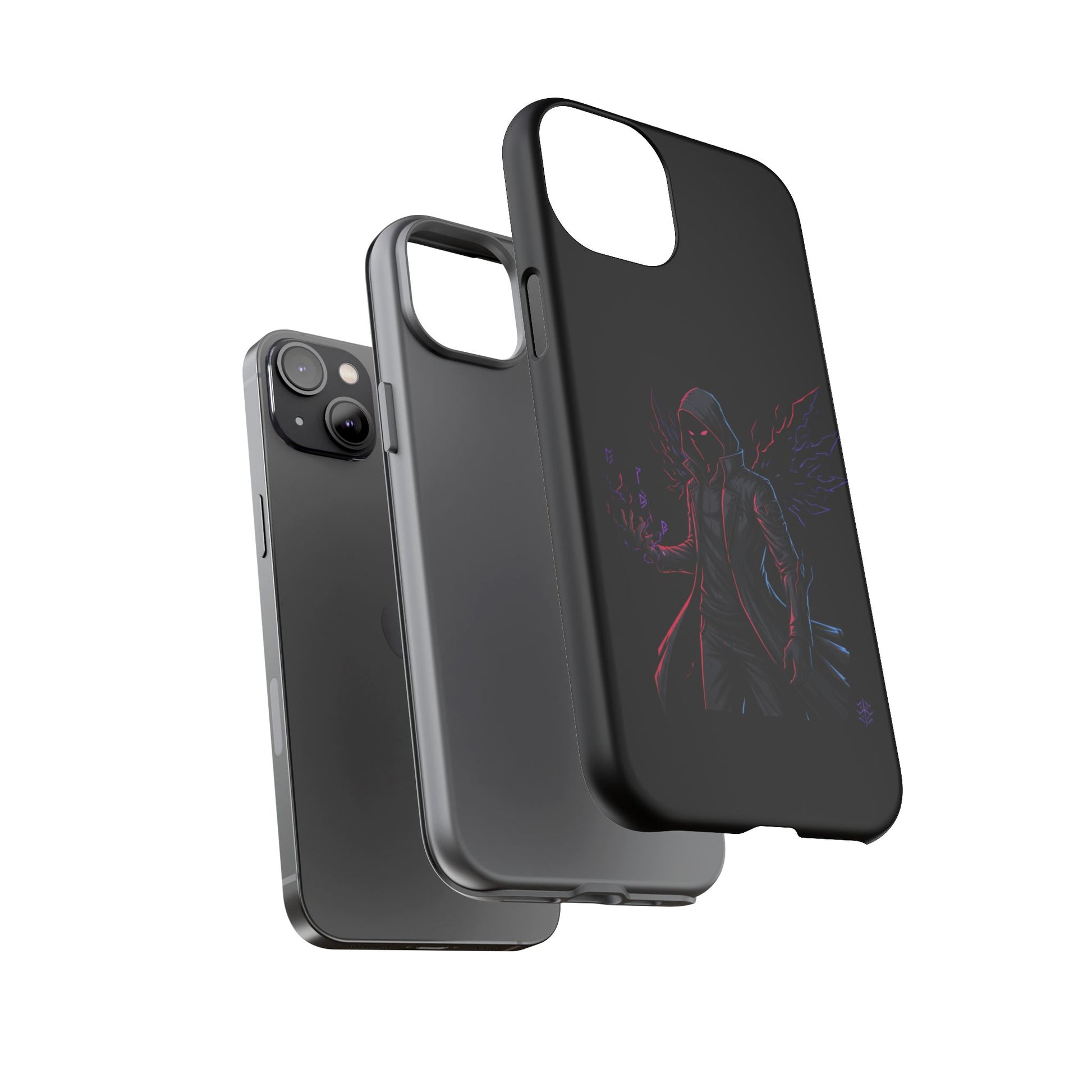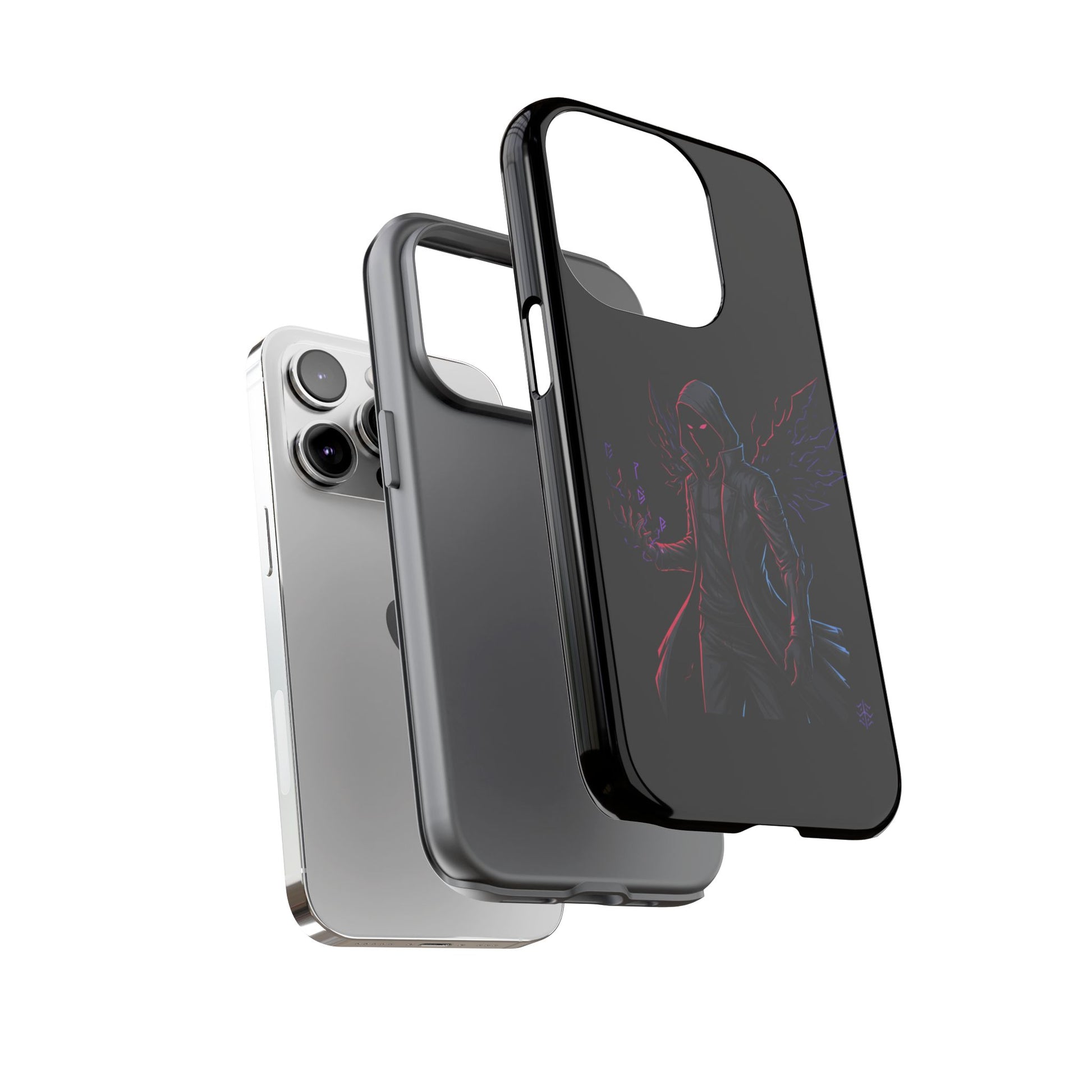 Dark Hoodie Shadow Warrior Phone Case – Protective Tough Case with Neon Winged Grim Reaper Design
