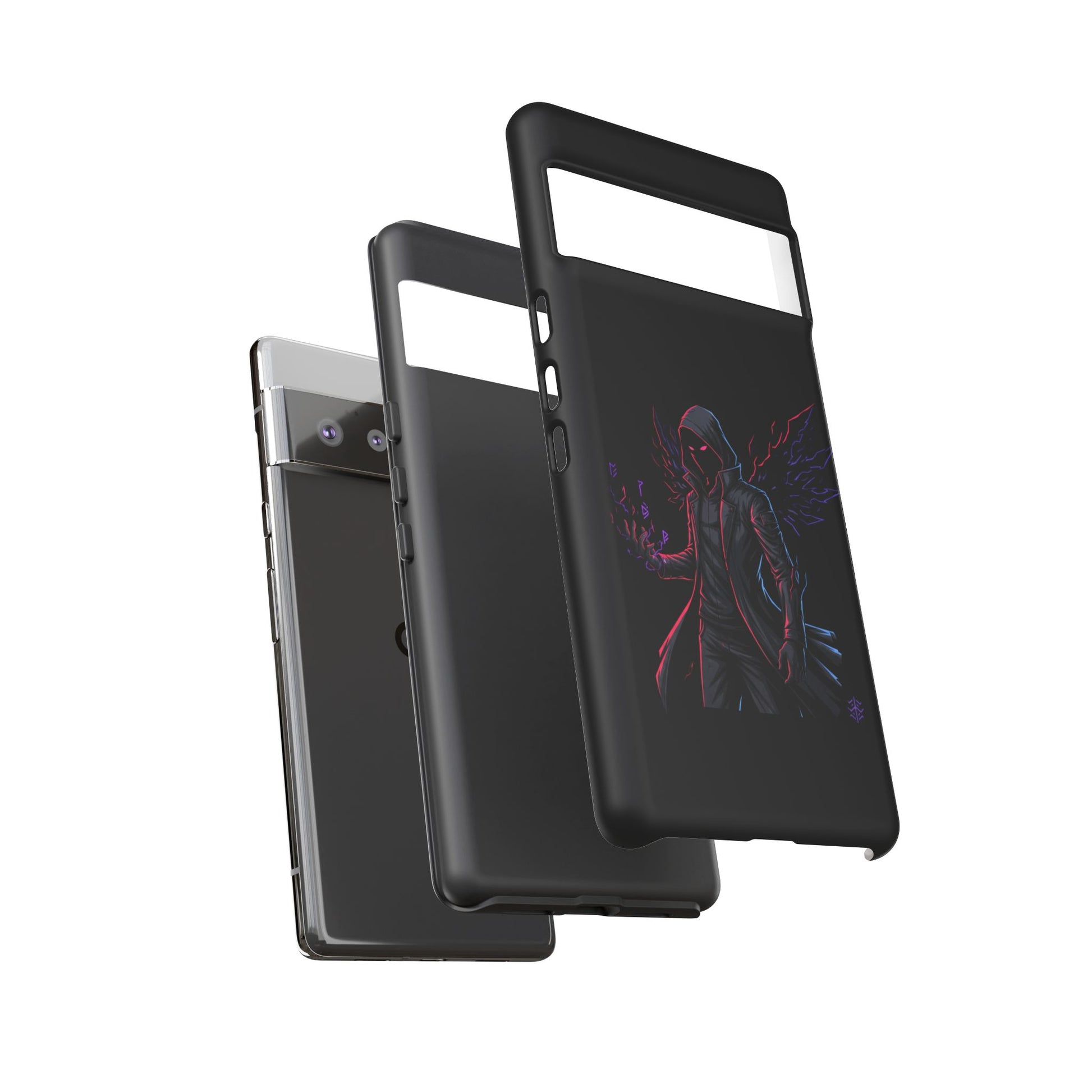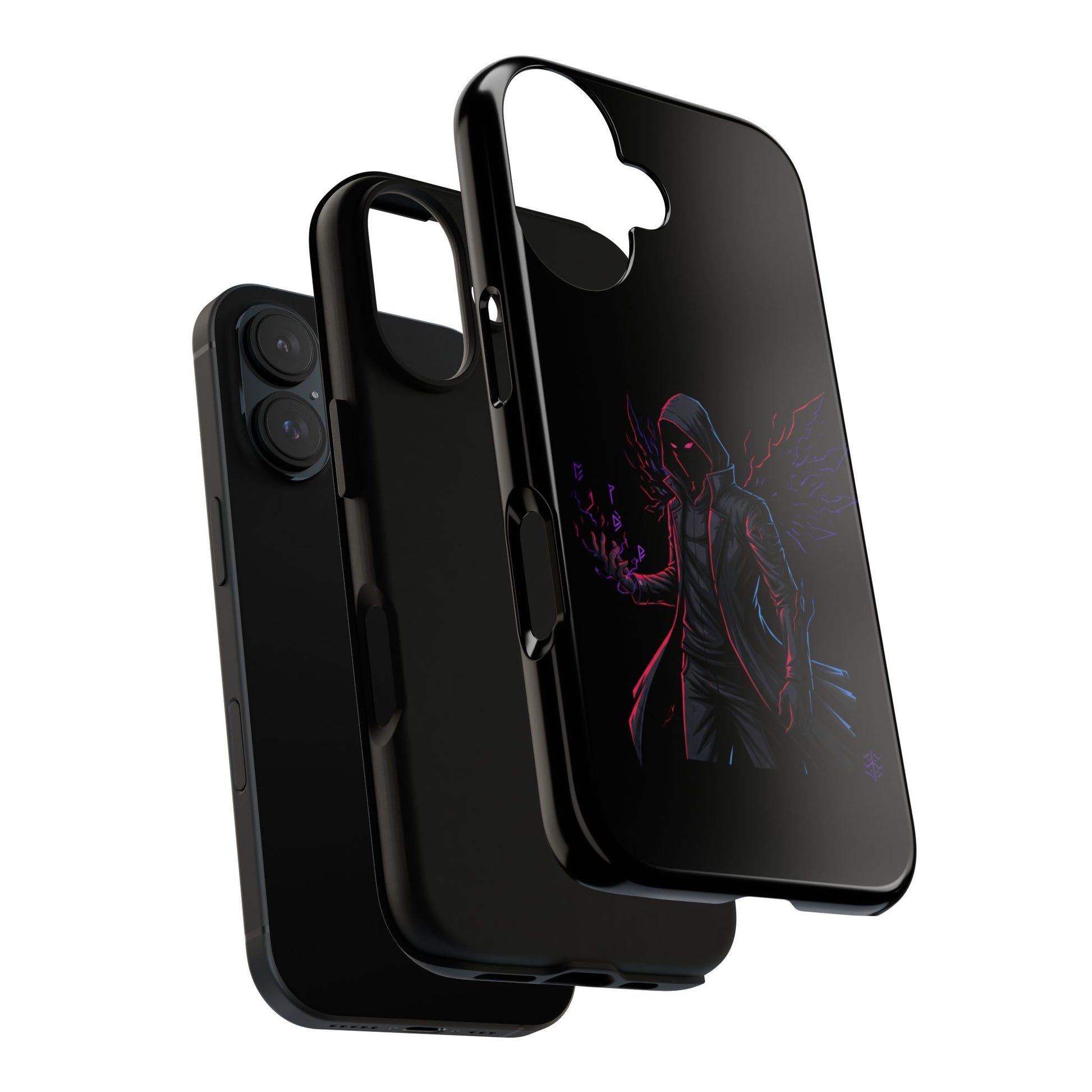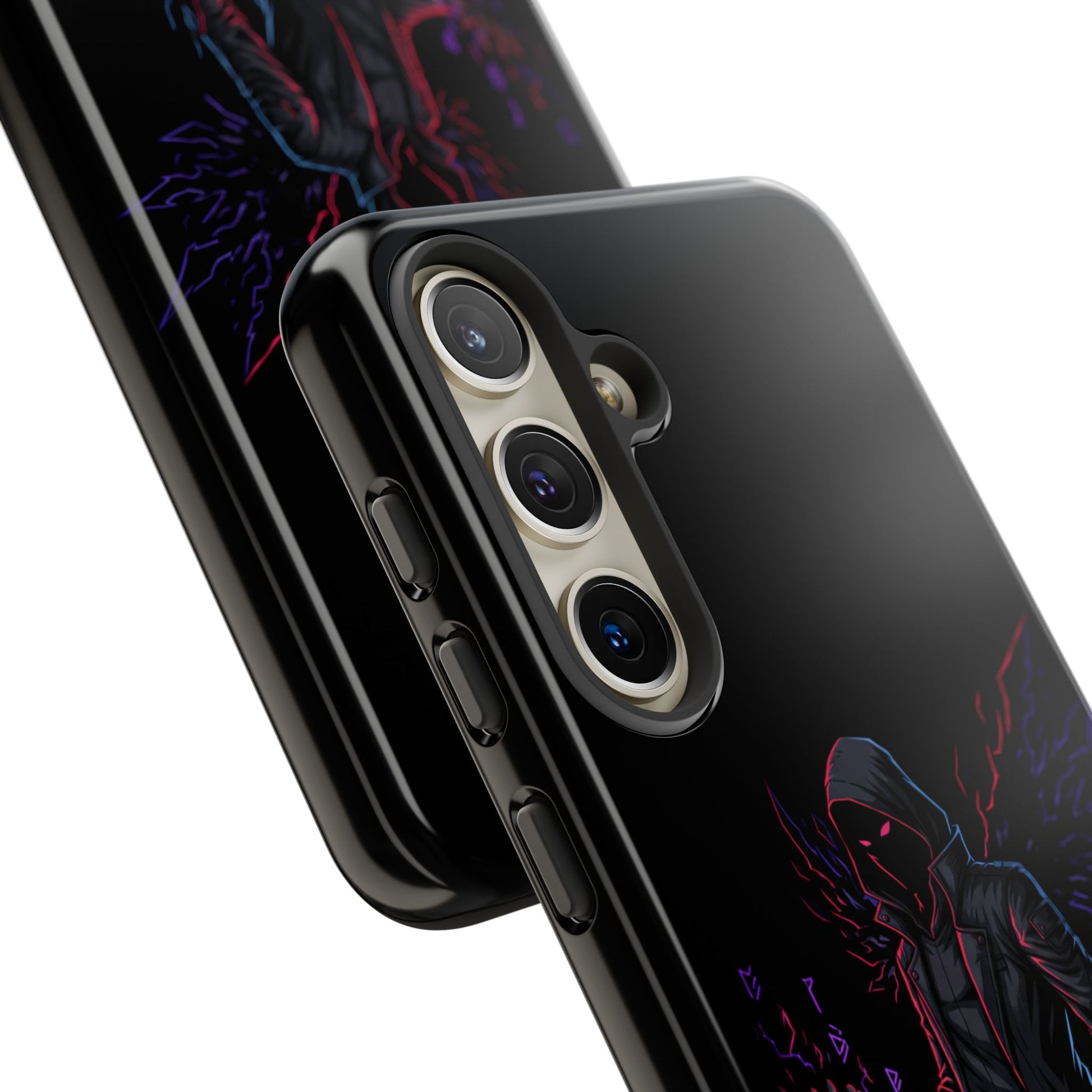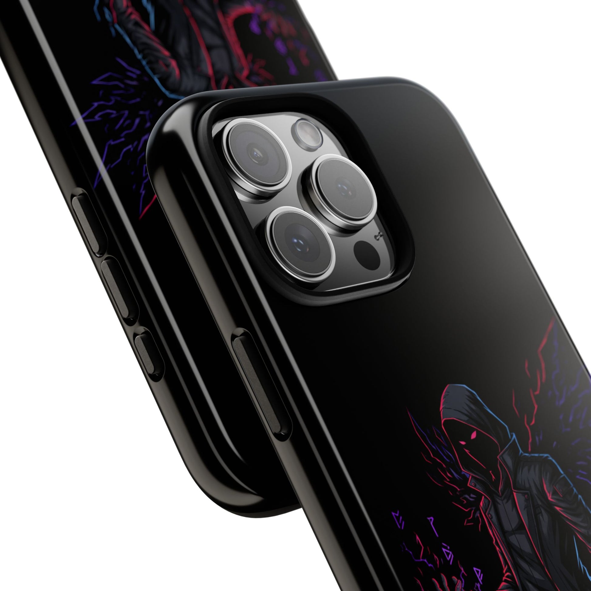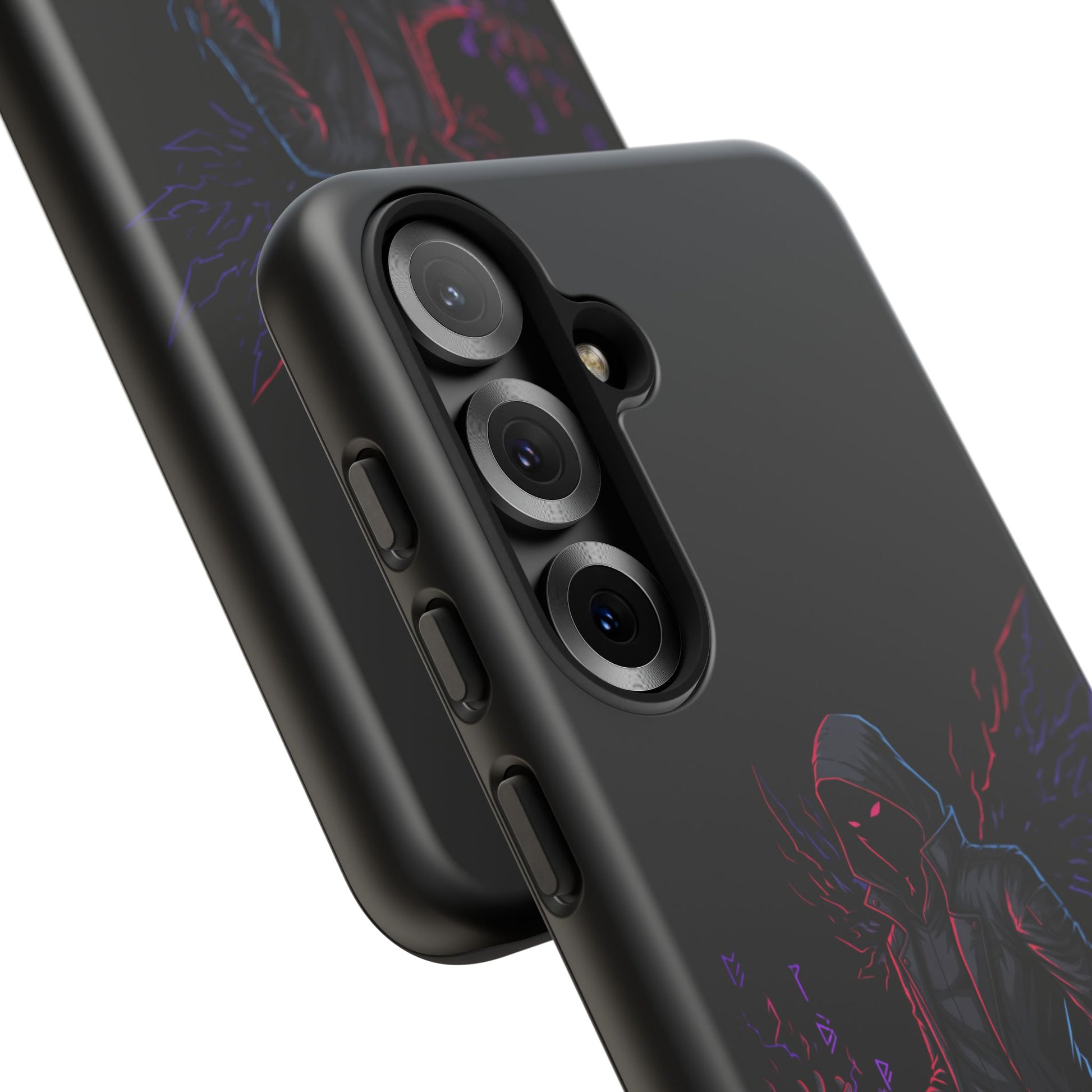 Dark Hoodie Shadow Warrior Phone Case – Protective Tough Case with Neon Winged Grim Reaper Design