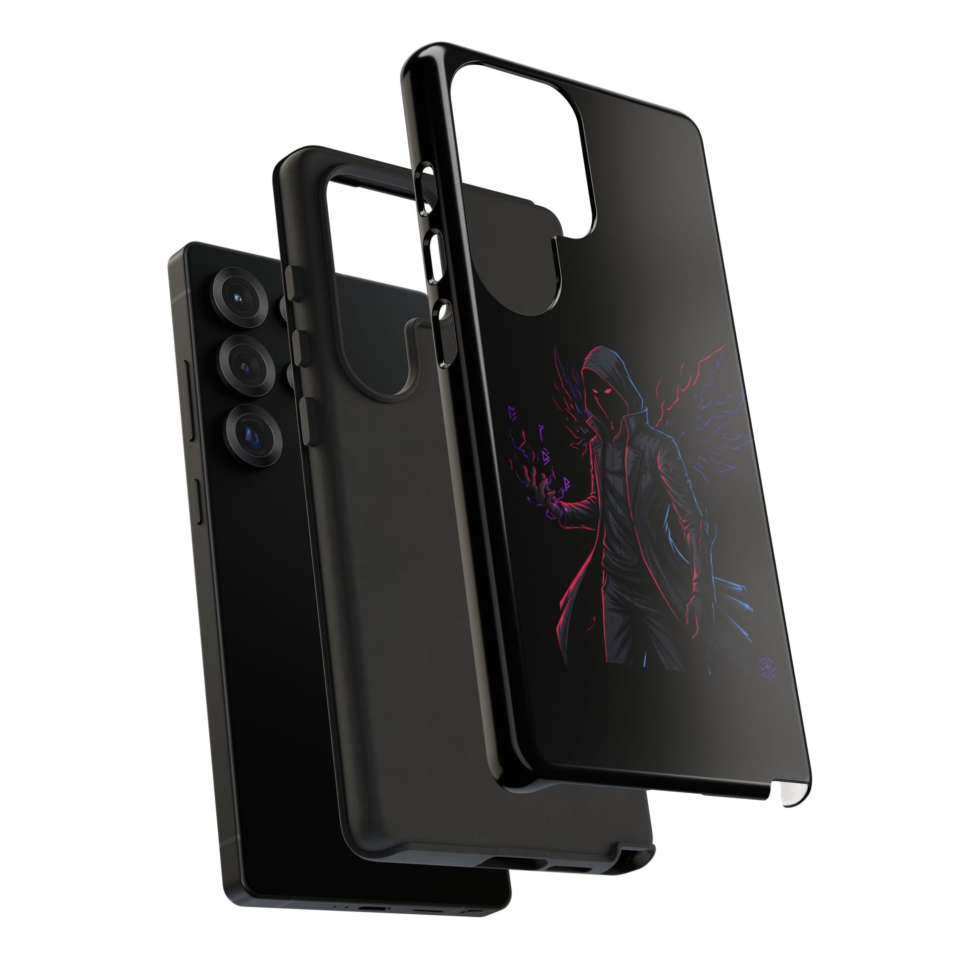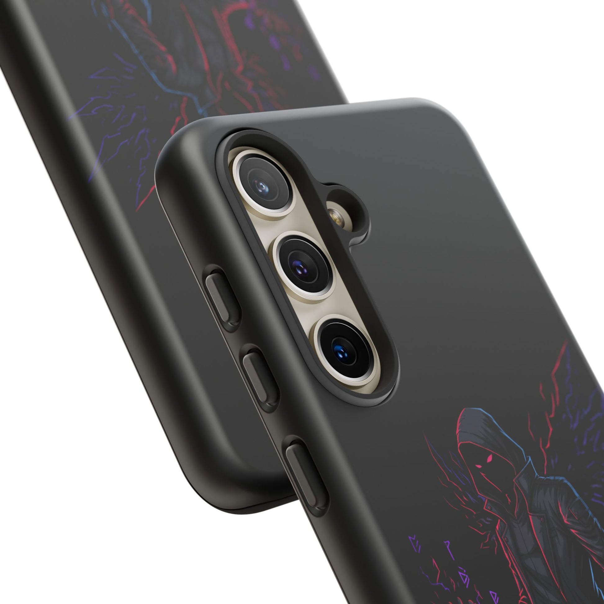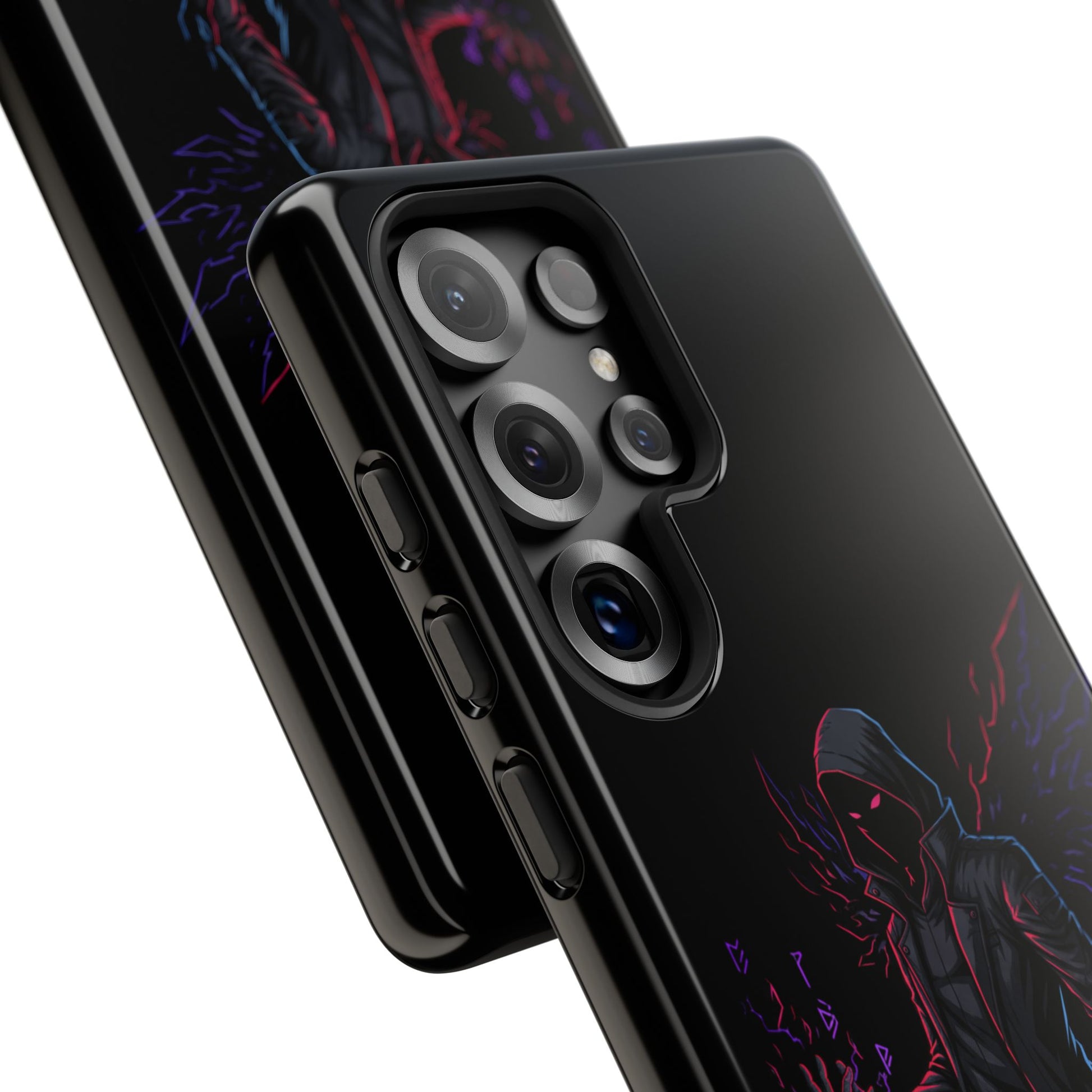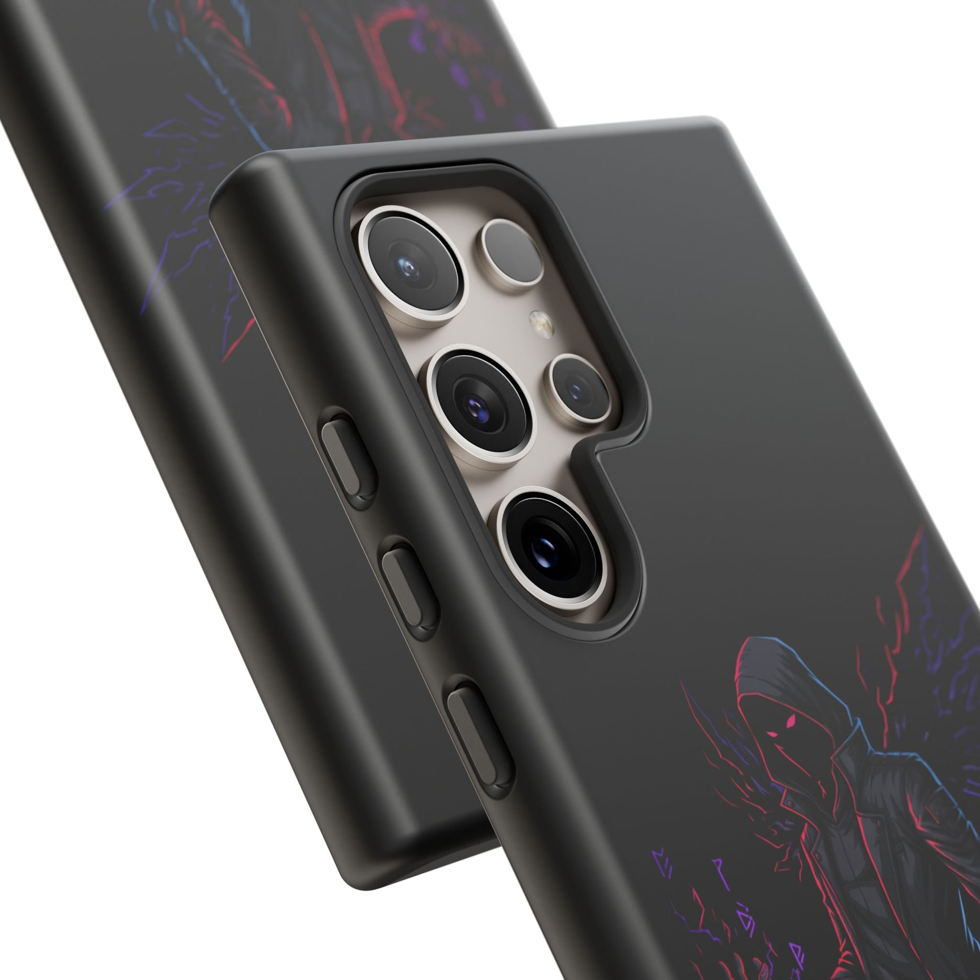 Dark Hoodie Shadow Warrior Phone Case – Protective Tough Case with Neon Winged Grim Reaper Design