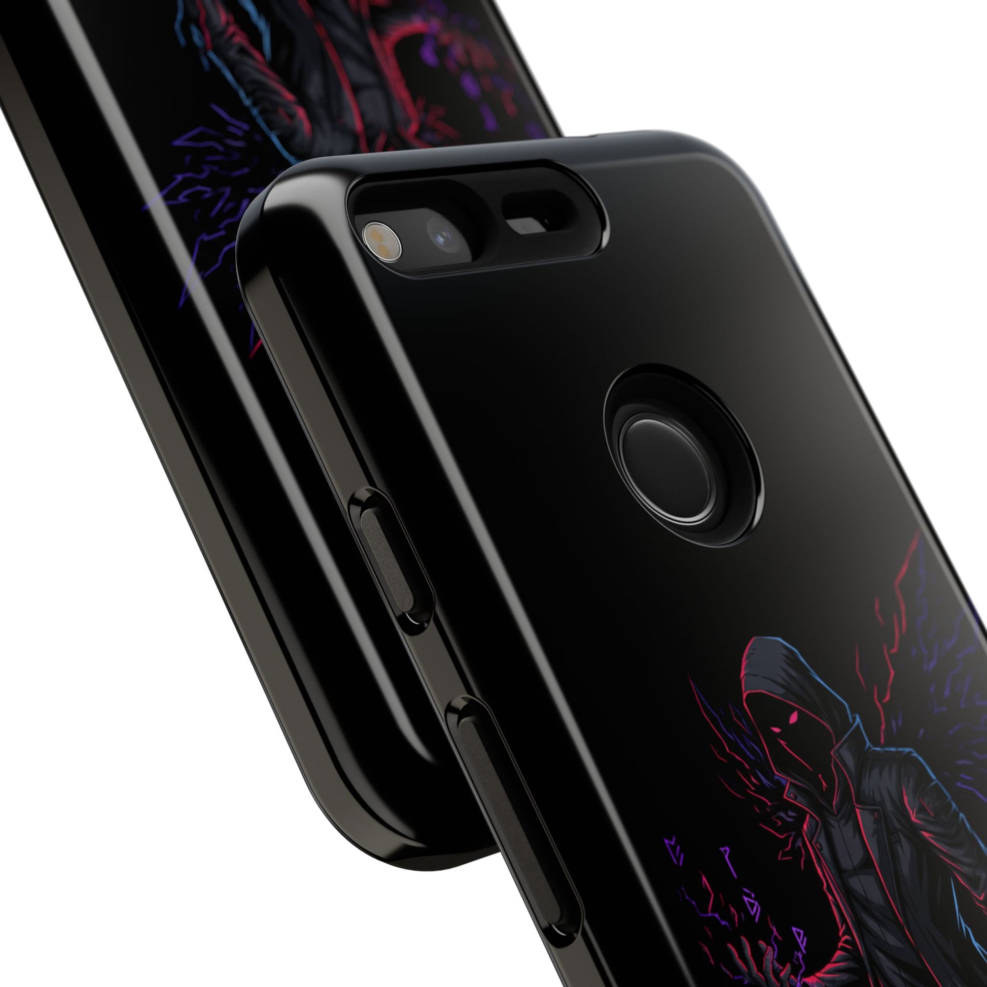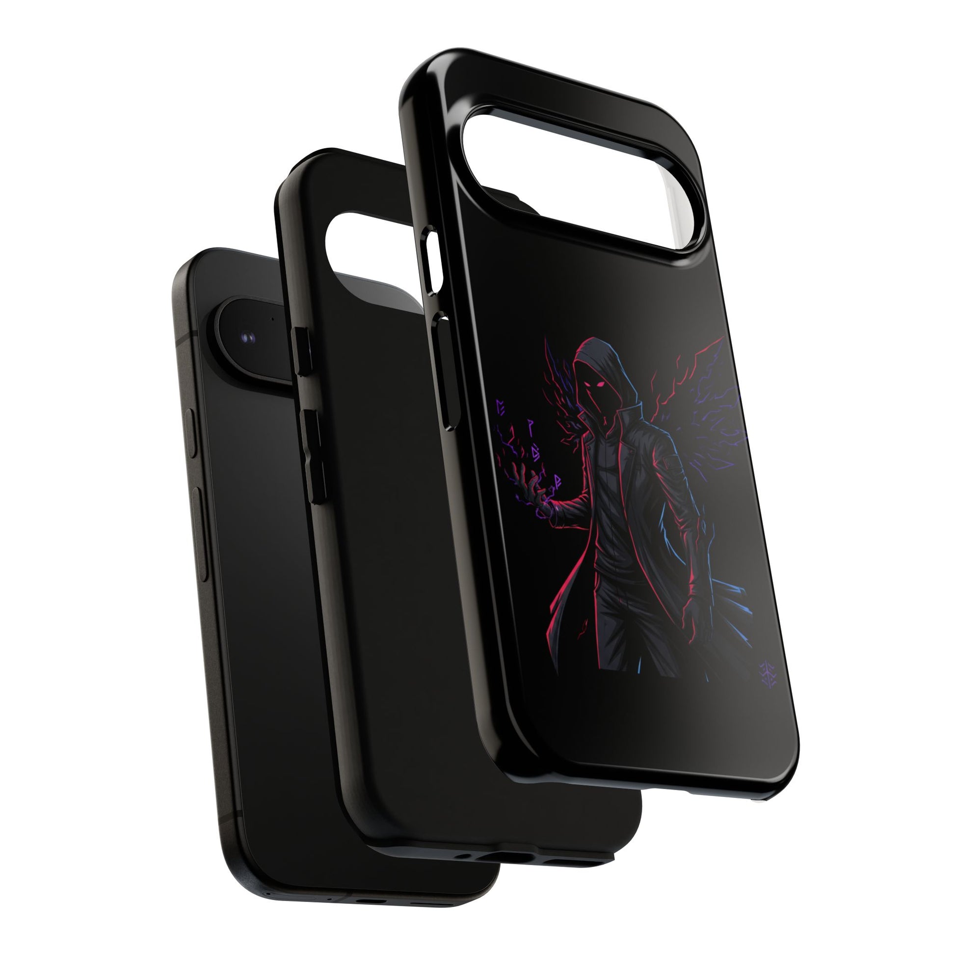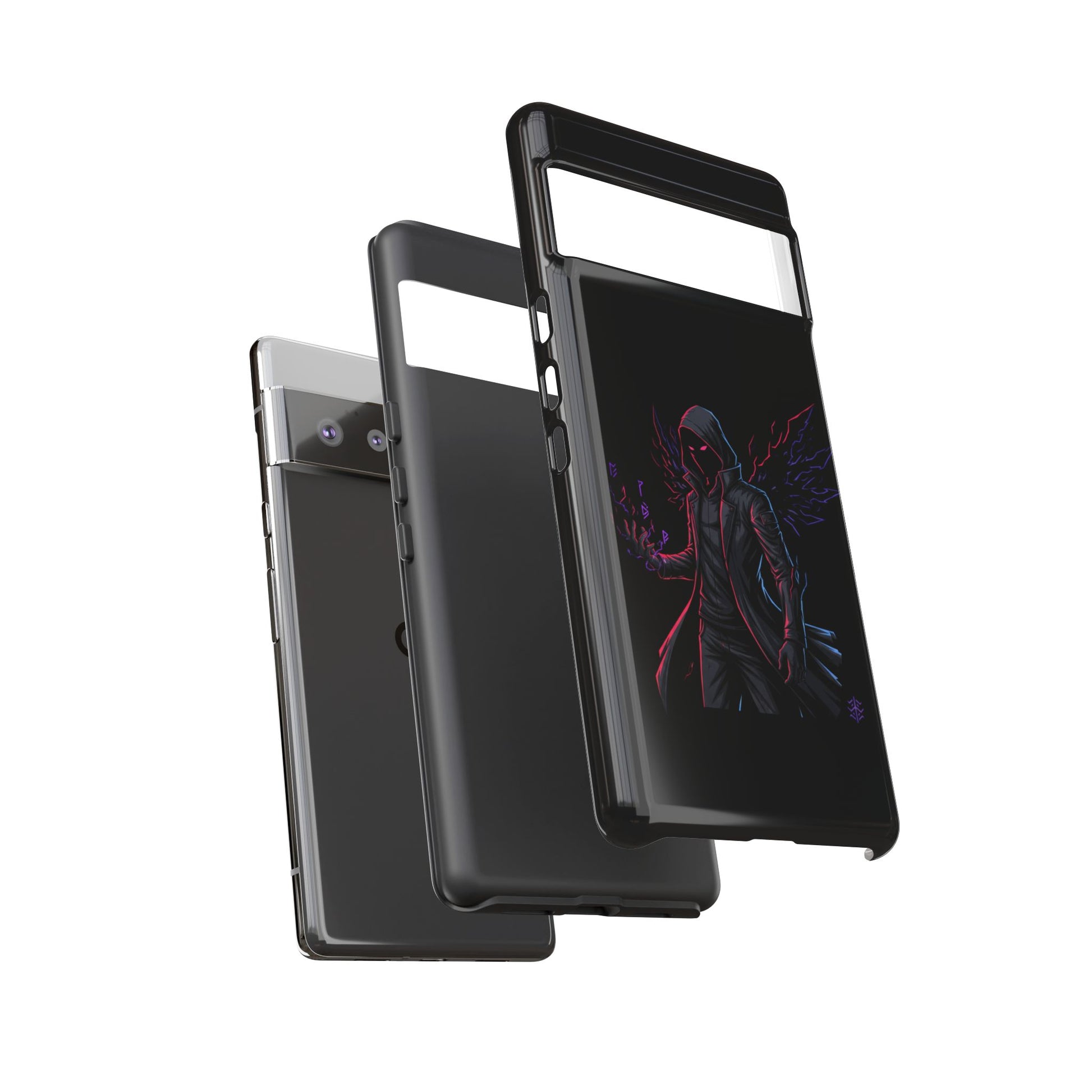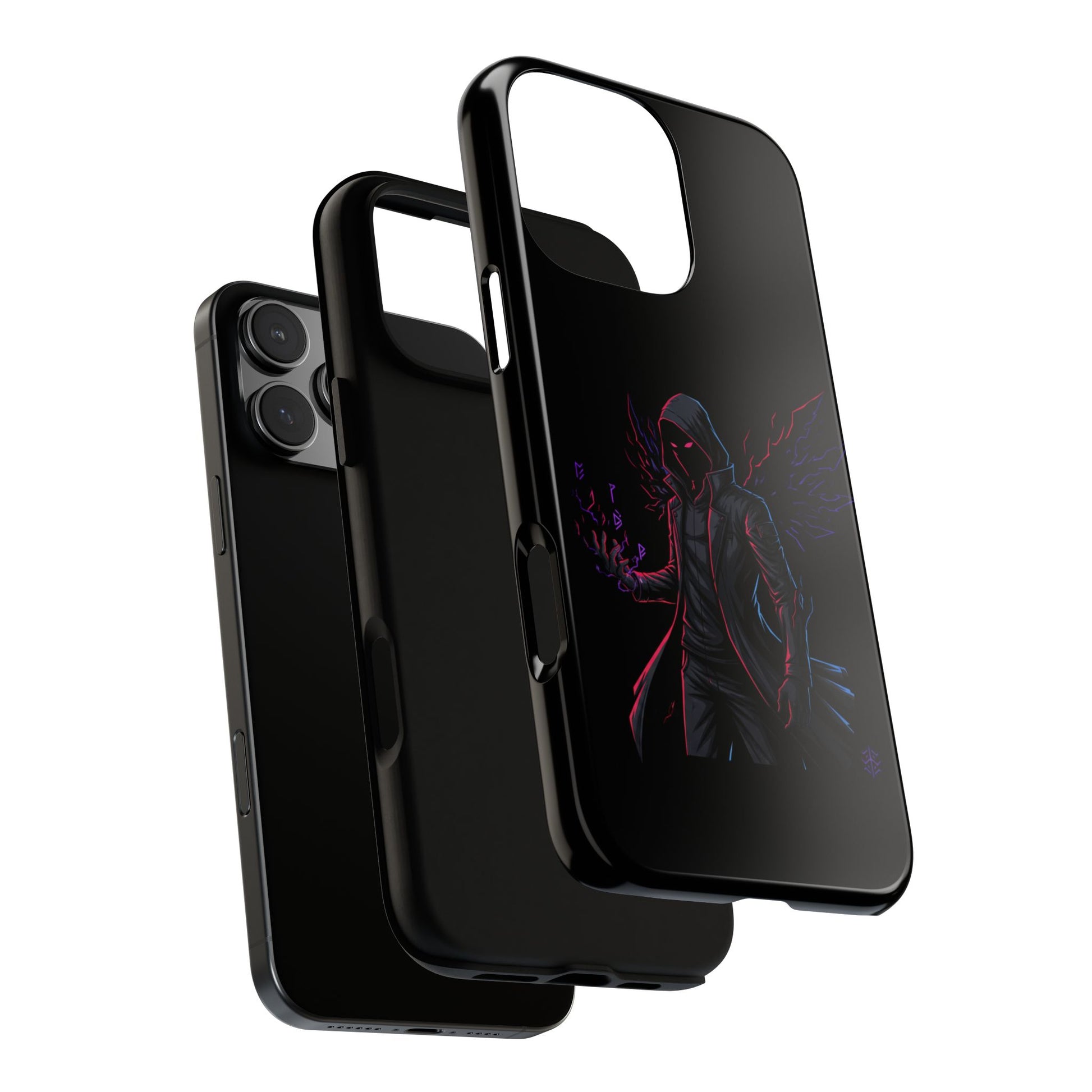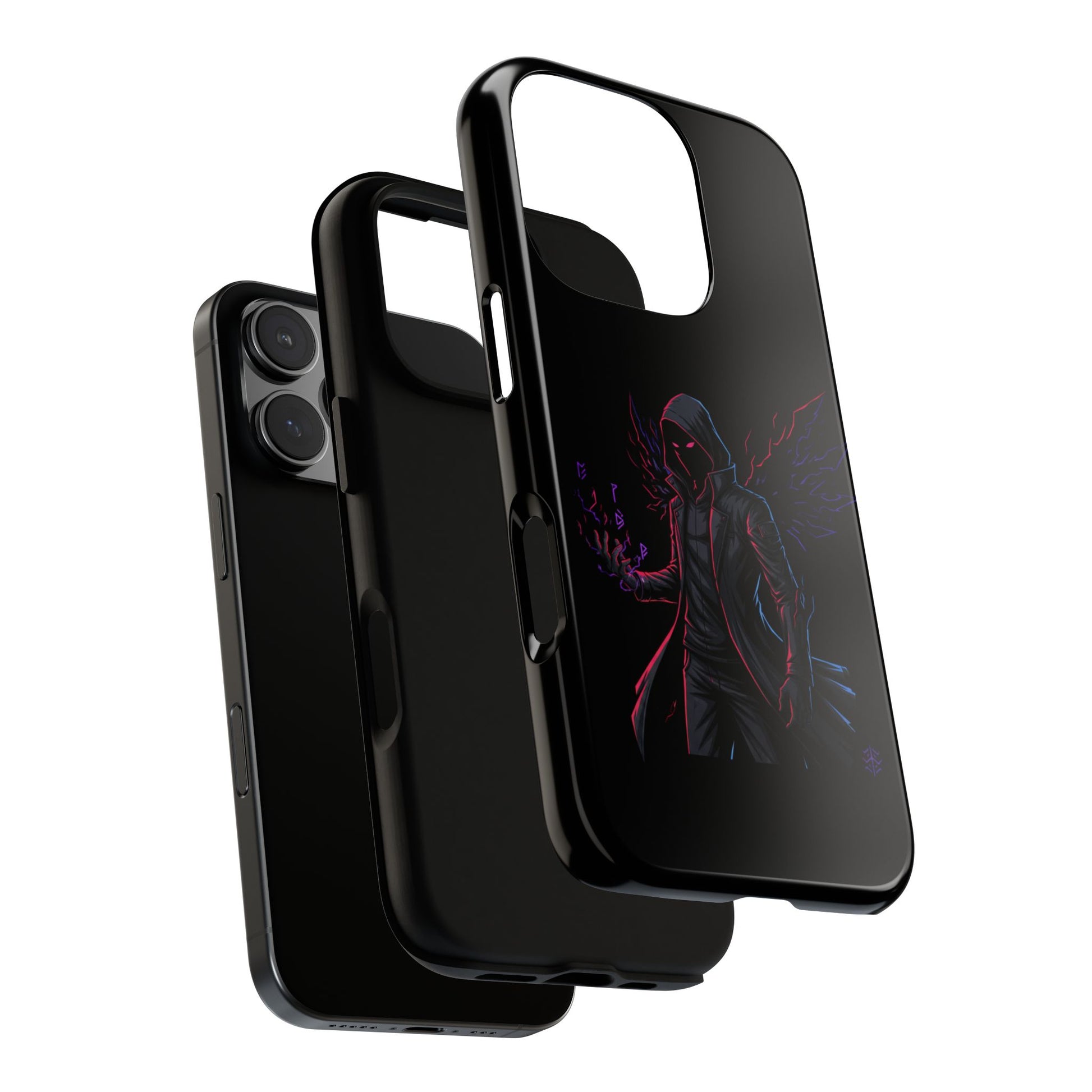 Dark Hoodie Shadow Warrior Phone Case – Protective Tough Case with Neon Winged Grim Reaper Design