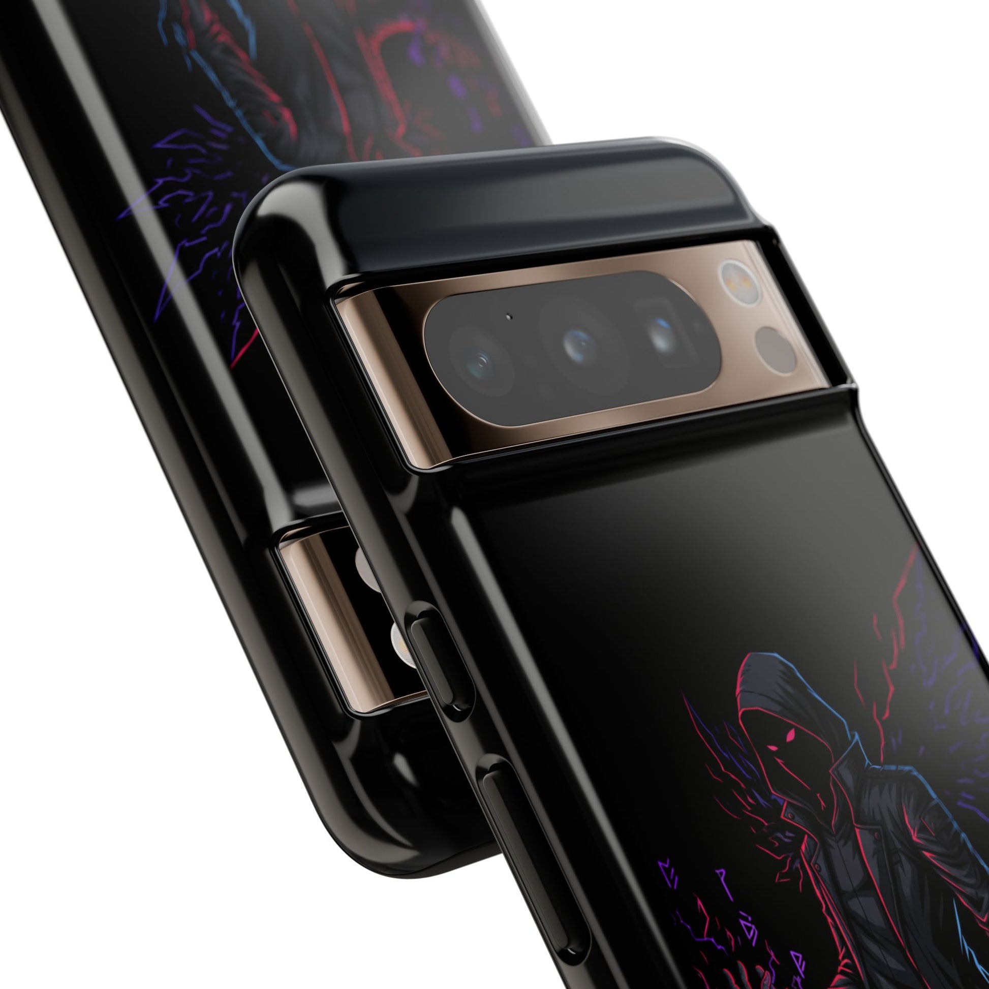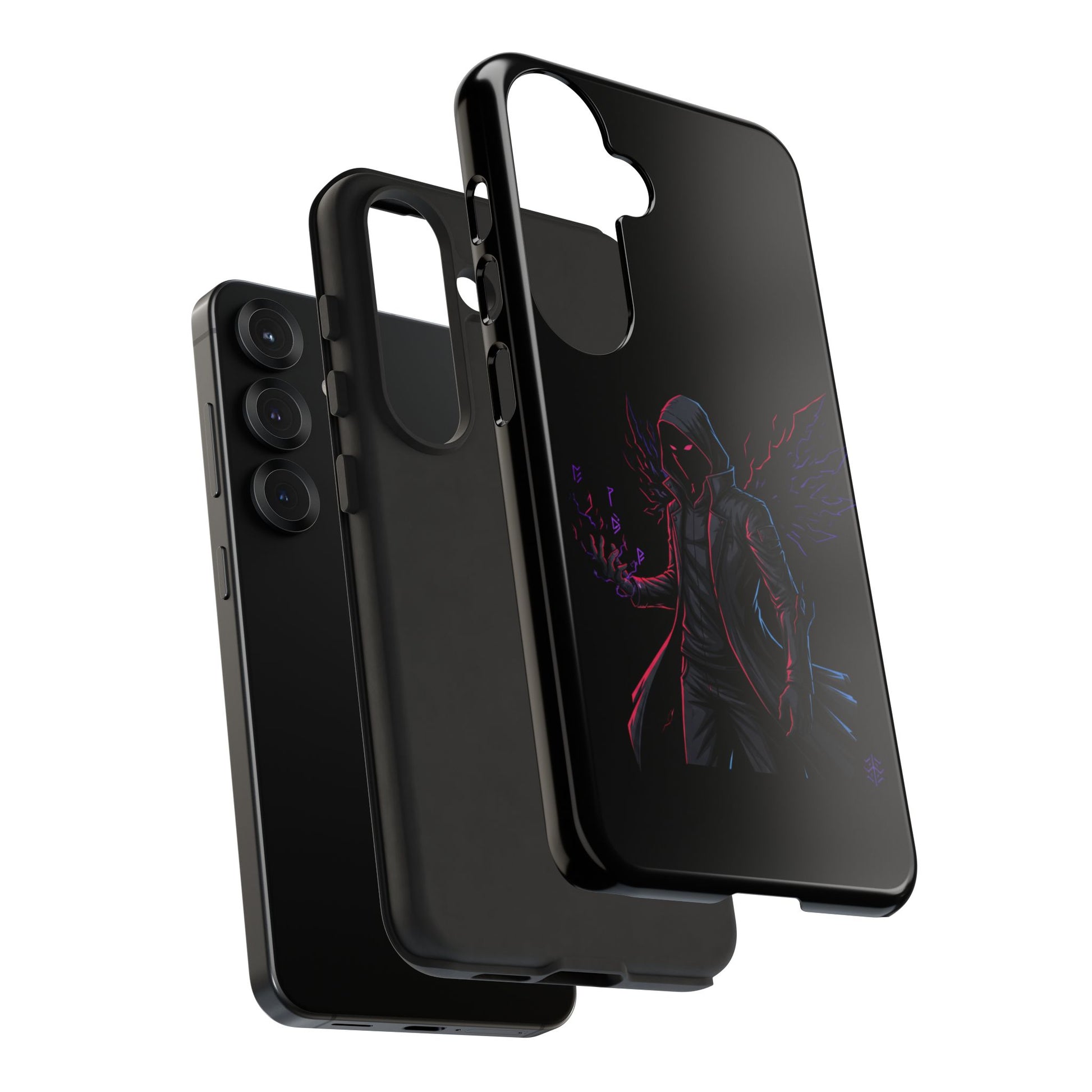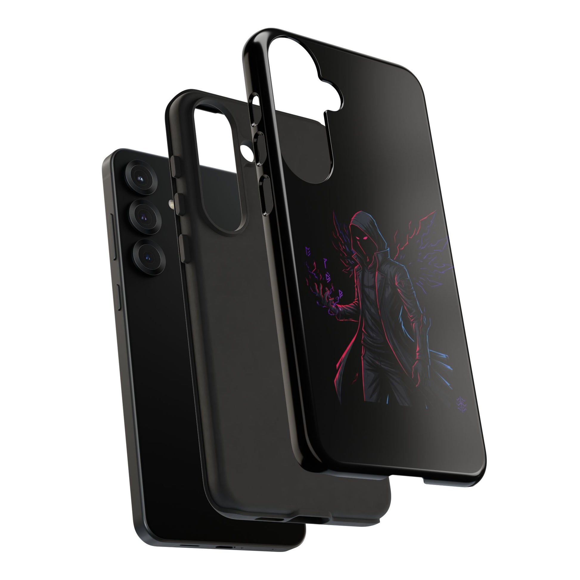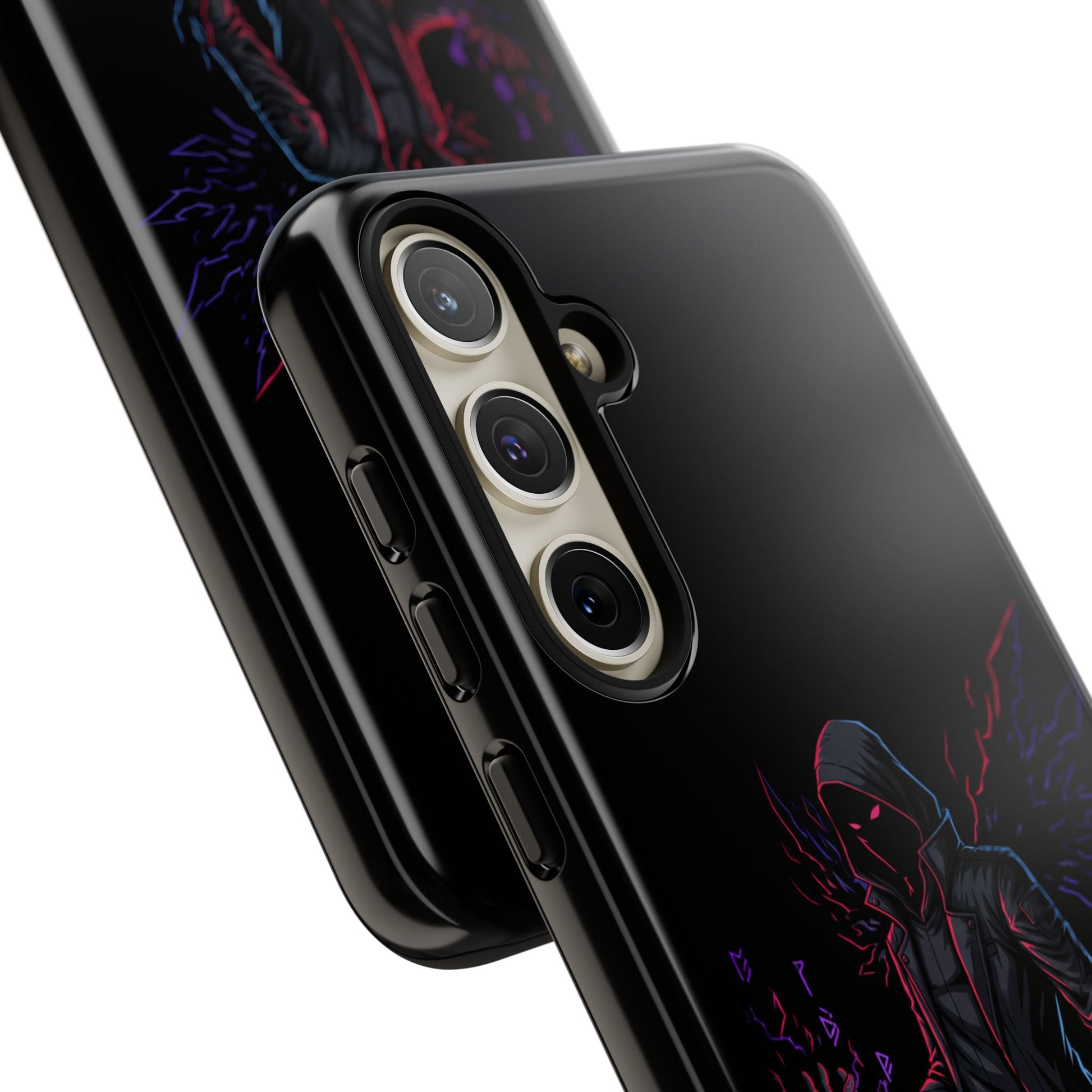 Dark Hoodie Shadow Warrior Phone Case – Protective Tough Case with Neon Winged Grim Reaper Design