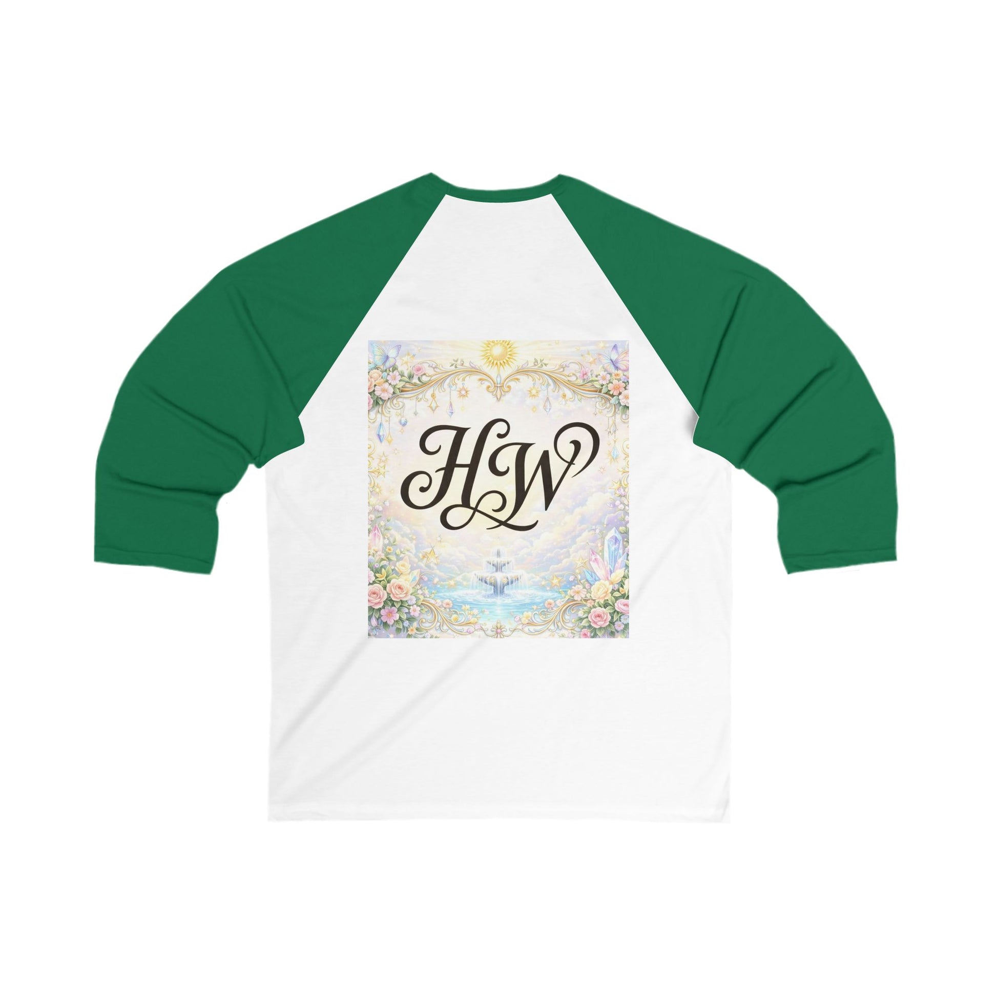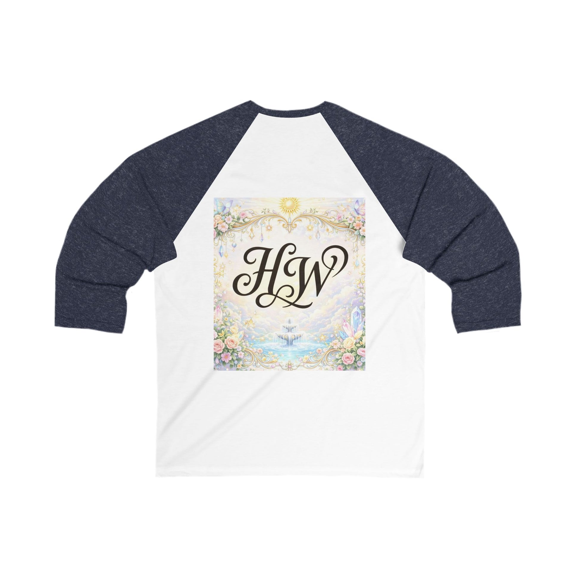 Soft, lived-in baseball tee with a vintage-inspired monogram at the center. The 3/4 raglan sleeves and lightweight fabric create an easy, breezy silhouette that moves with you. Front shows an elegant HW script; back reveals the same initials framed in a pastel, floral, sunlit scene—like a keepsake postcard stitched into your everyday wear. It sits close to the body without feeling heavy, so it layers well under a denim jacket or stands alone on cooler mornings. Wear it to slow coffee shop mornings, casual road trips, or backyard gatherings when you want something that feels familiar and a little nostalgic.